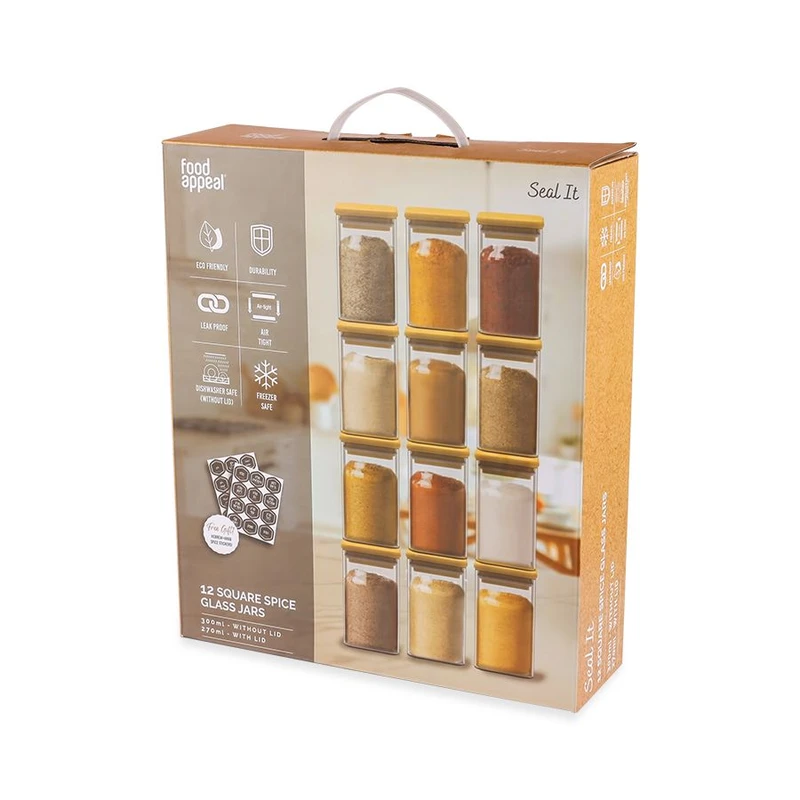 מארז 12 צנצנות תבלינים מרובעות עם מדבקות פוד אפיל